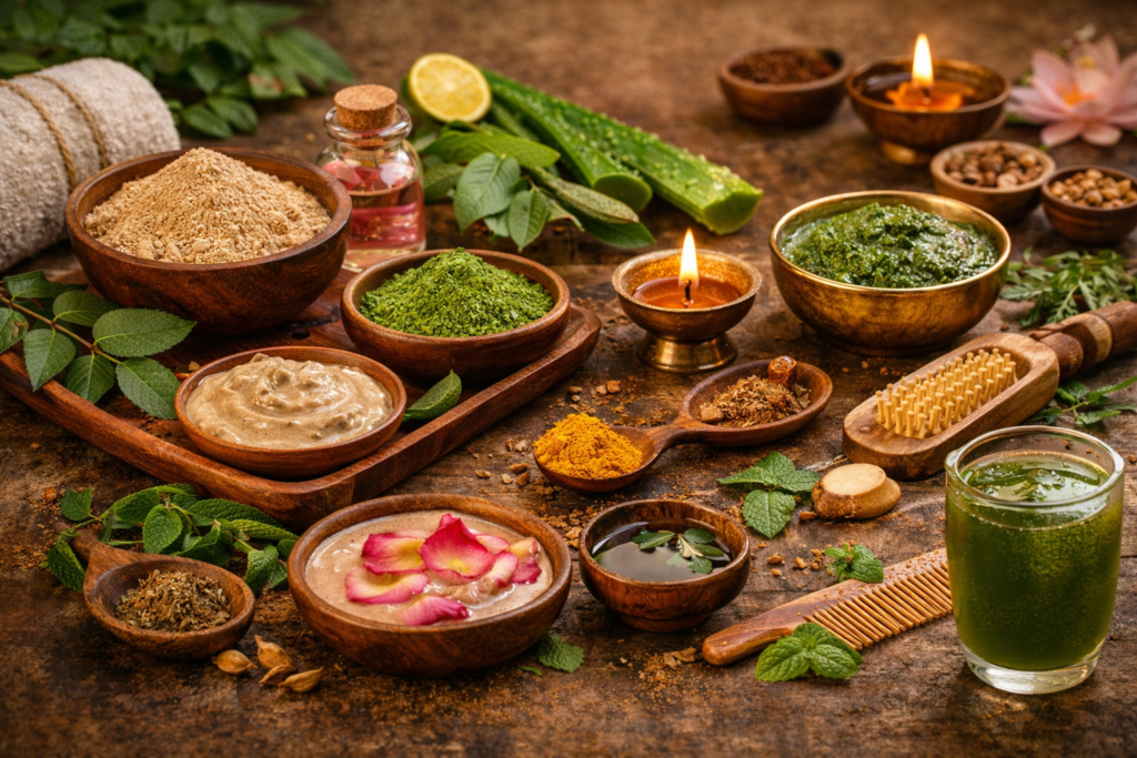 Ayurvedic hair masks nourish the scalp, strengthen hair roots, and improve hair texture naturally. These remedies help reduce hair fall, dandruff, and dryness when used consistently.